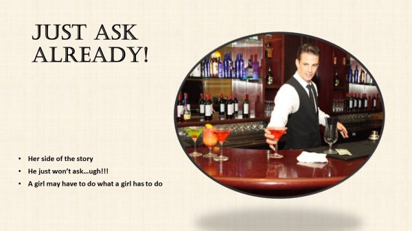 Why must men make things so difficult. All they have to do is just ask... and accept whatever answer they get. NO.. Men just love making things difficult. A woman can only do so much to drop a hint. Maybe, just maybe, taking the ball into her own court might do the trick. Men! Just Ask Already!!!